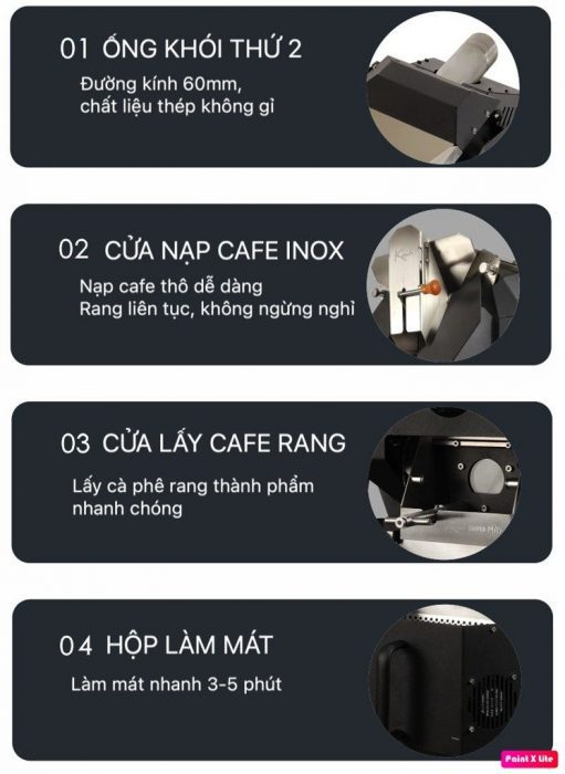 - Hệ thống quạt thông gió và khuấy đảo điều phối khoa học giúp rang cà phê chín đều