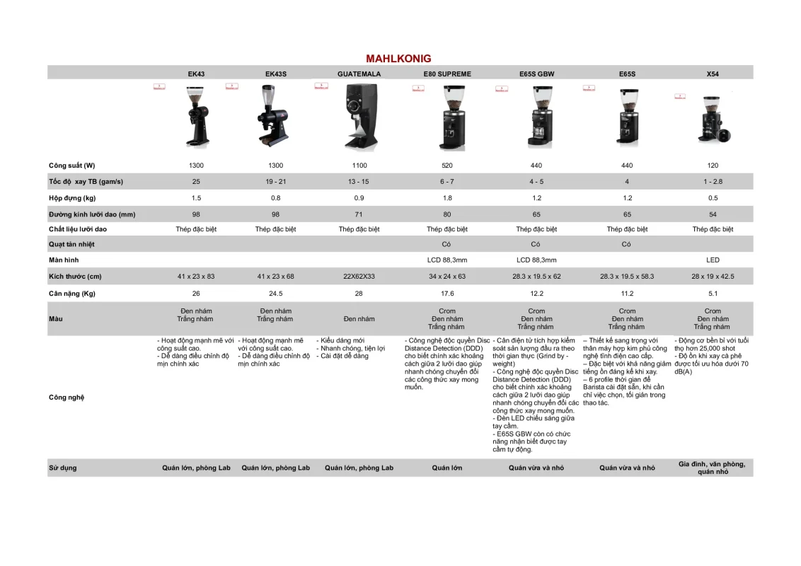 Được mệnh danh là “Vua của các loại máy xay”, Mahlkönig (thành lập năm 1924 tại Đức) đã khẳng định vị thế độc tôn trong làng cà phê thế giới suốt hơn 100 năm qua. Mọi sản phẩm của Mahlkönig đều là sự kết hợp giữa kỹ nghệ cơ khí chính xác của người Đức và sự thấu hiểu sâu sắc về nhu cầu của các Barista chuyên nghiệp.