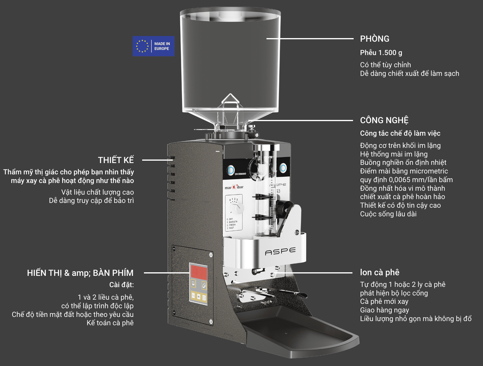 Máy xay cà phê tự động ASPE được thiết kế dành cho các Barista, những người yêu thích cà phê và kinh doanh Horeca. ASPE cho phép ba chế độ làm việc: < a i=3> Nhân viên pha chế, Tươi mới và Nhanh chóng thích ứng với những nhu cầu khắt khe nhất.