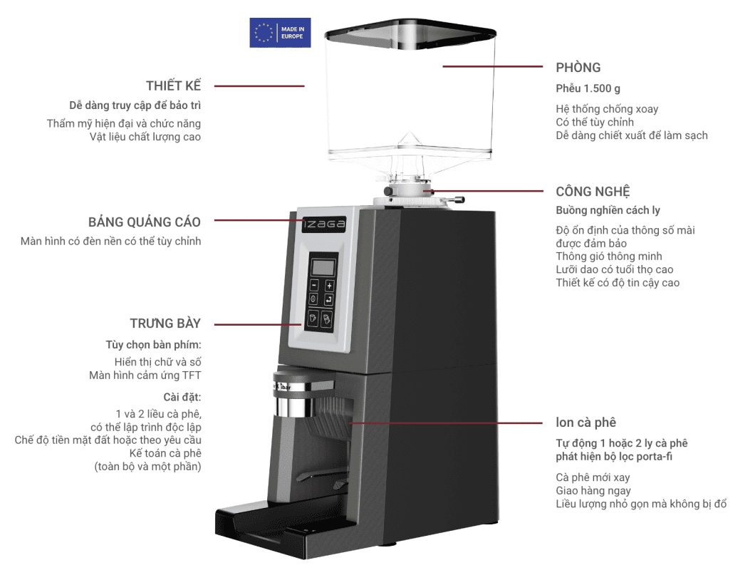 Máy xay cà phê tự động IZAGA có công nghệ tiên tiến nhất để đảm bảo hiệu suất cao.